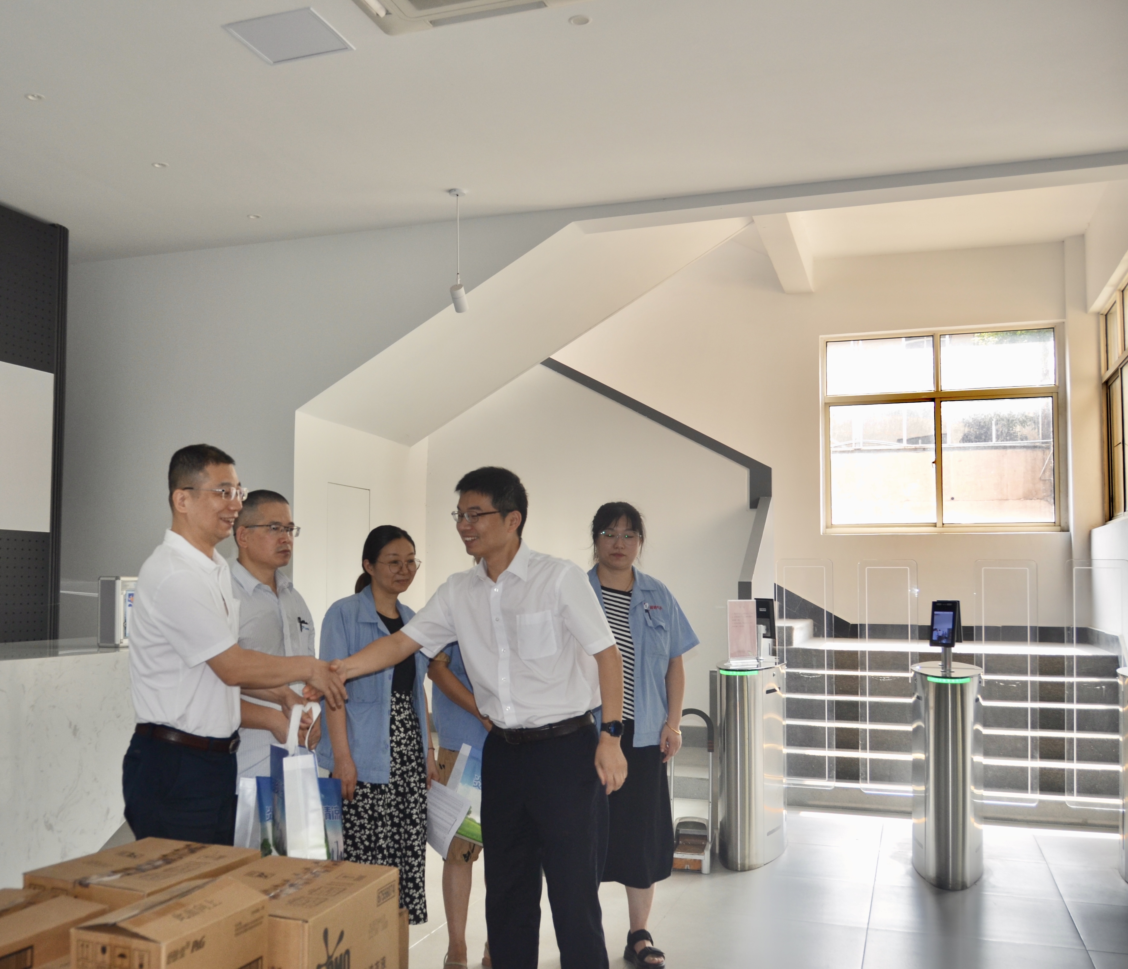 “炎炎夏日送清涼,濃濃關愛沁人心。”近日,徐舍鎮黃鎮長攜鎮總工會及相關領導一行來我司開展送清涼活動,走訪慰問奮斗在高溫崗位的一線員工,為他們送去了防暑降溫用品,讓他們在酷暑中感受到一絲清涼。活動中,徐舍鎮相關領導及工會向奮戰在一線的勞動者表示由衷的感謝和問候,與員工代表們親切交談,叮囑大家注意勞逸結合,防暑降溫,確保安全生產工作有序進行。開展“夏送清涼"的活動,是工會關心職工生活,保障職工權益的重要舉措,我司把防暑降溫工作作為夏季重點工作來抓。切實關心職工身體健康和勞動安全。把防暑降溫工作和勞動安全保障落實到各高溫崗位的職工,讓他們在炎炎夏日感受到物質精神的雙清涼。